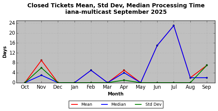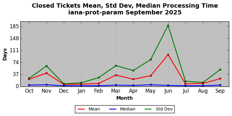 September 2025Due to the nature of resource request reviews, ICANN/IANA and the IETF community are jointly responsible for cooperatively managing the resource request process. ICANN/IANA has control over the functions it performs directly, e.g., receiving requests, making sure they are syntactically and semantically sensible, forwarding the requests to Designated Experts where appropriate, creating and modifying the registries, etc. The IETF community has direct or indirect control over functions performed by third parties, including IESG Designated Experts, the IESG, the IAB, the RFC Editor, and the requester. As such, the processing of requests has a “gross processing time” calendar days goal established for each function and a “net processing time” calendar days goal to reflect time expended directly by ICANN/IANA.