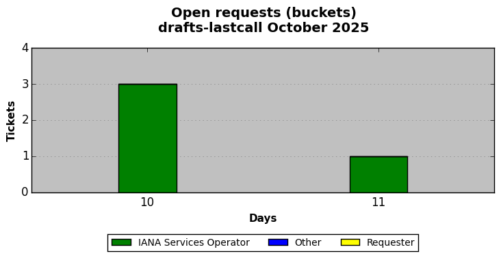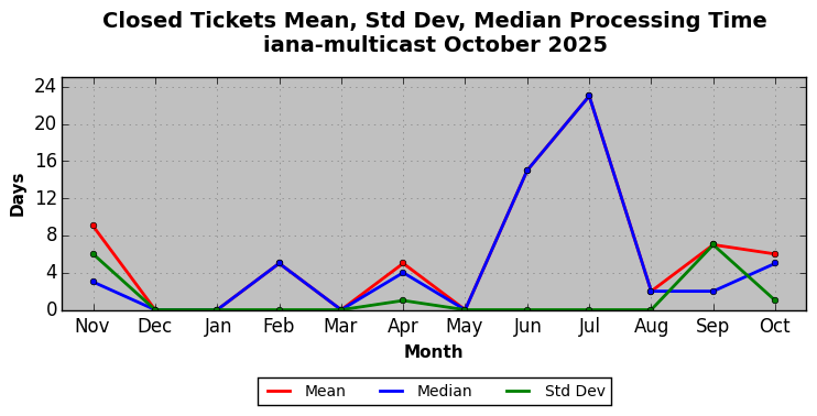 October 2025Due to the nature of resource request reviews, ICANN/IANA and the IETF community are jointly responsible for cooperatively managing the resource request process. ICANN/IANA has control over the functions it performs directly, e.g., receiving requests, making sure they are syntactically and semantically sensible, forwarding the requests to Designated Experts where appropriate, creating and modifying the registries, etc. The IETF community has direct or indirect control over functions performed by third parties, including IESG Designated Experts, the IESG, the IAB, the RFC Editor, and the requester. As such, the processing of requests has a “gross processing time” calendar days goal established for each function and a “net processing time” calendar days goal to reflect time expended directly by ICANN/IANA.